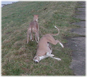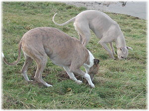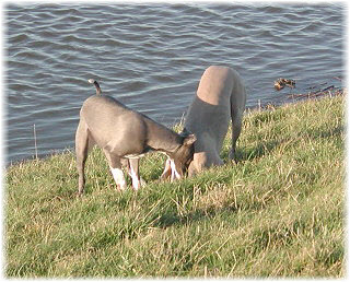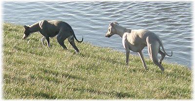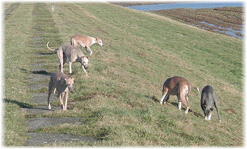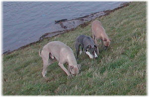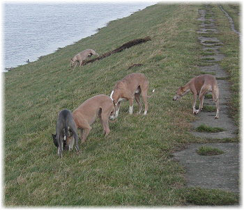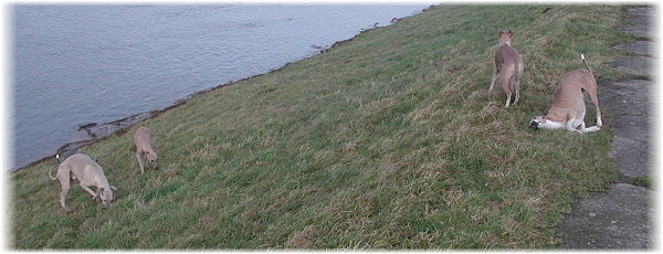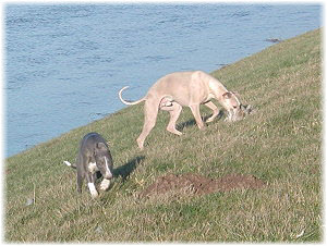 Tess und Juke kontrollieren die Mauselöcher im Deich. |