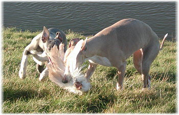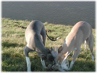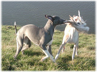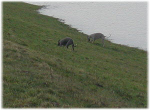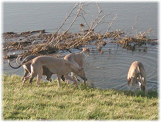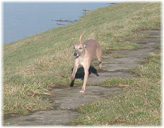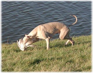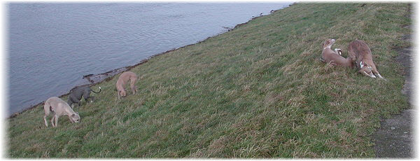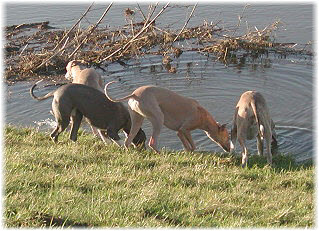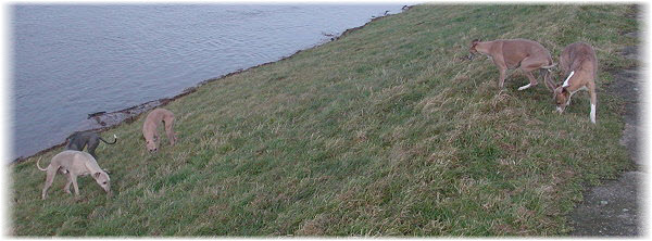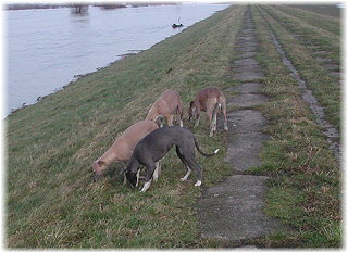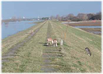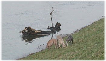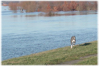 Nachdem uns der Winter im Dezember fest im Griff hatte, folgte Anfang Januar Tauwetter und schnell füllte sich die Elbe. Da, wo sonst unsere Hunde lustig über die Wiesen toben können, hat sich die Elbe ausgebreitet. So bekommt der Begriff "Auslaufgebiet" eine ganz andere Bedeutung... Tess ist nun schon alt genug, um mit den Großen am Deich zu spielen - und es gibt ja soviel zu entdecken. Nicht nur für sie... | ||