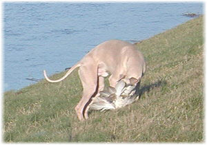 Maggie findet einen Rest Federvieh. | Tess gefällt das. | Sogar sehr. |