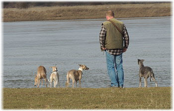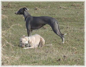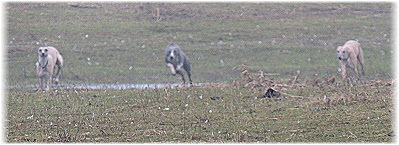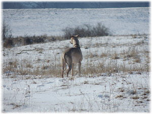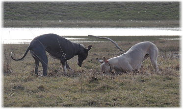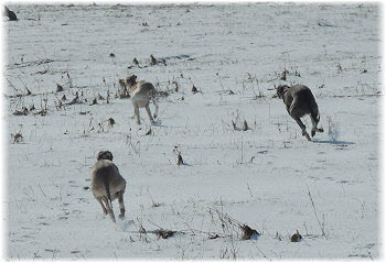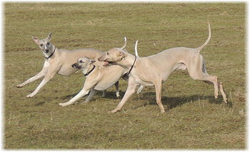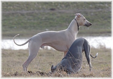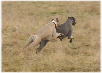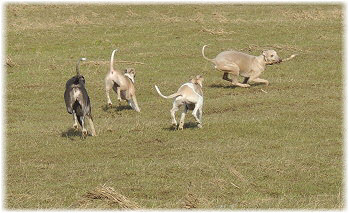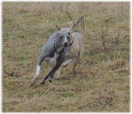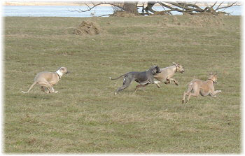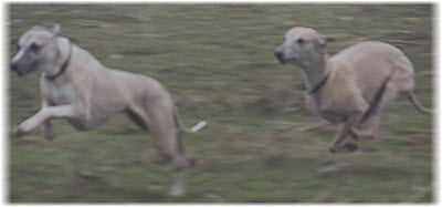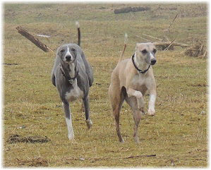Dann ertönt Herrchens Pfiff... | ... und Tess und Joya starten durch. | Wir kommen schon! |