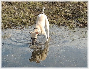 Lotta findet die Blubberblasen toll, aber wer ist der andere Whippet im Wasser? |