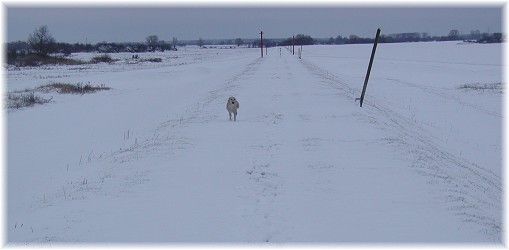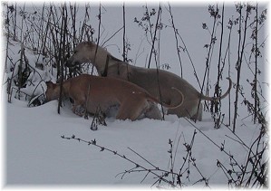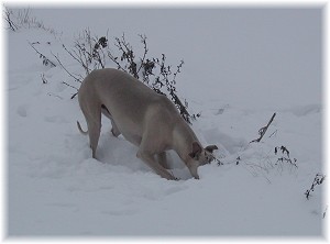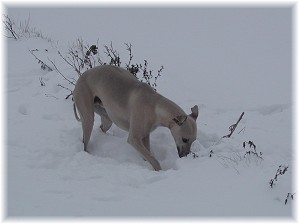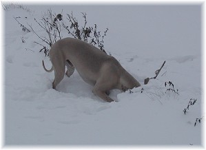 Juke merkt davon gar nichts, viel zu interessant riecht es hier - wer mag sich nur unter dem Schnee versteckt haben? - Und schon ist Juke "kopflos"... |