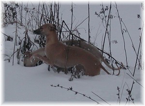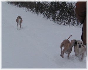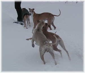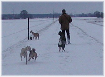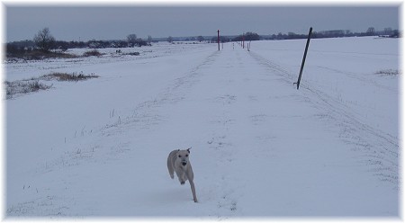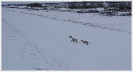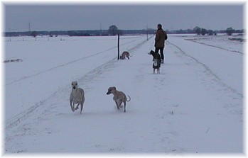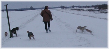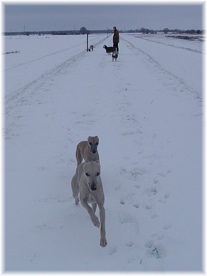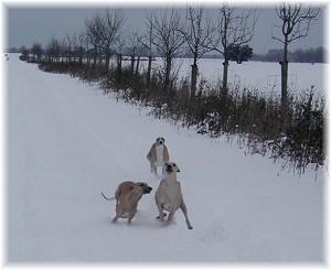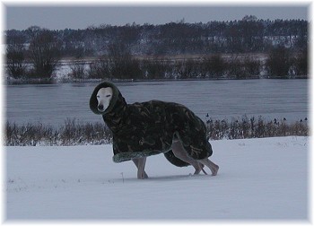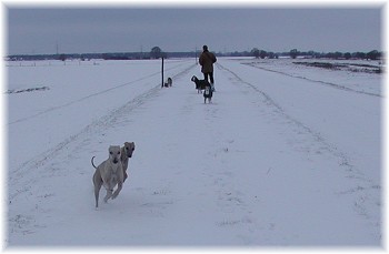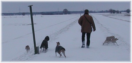 Der Winter hat Einzug gehalten und das Land mit für unsere Verhältnisse schon dickem Schnee bedeckt. Bald werden wir wohl nicht mehr mit dem Auto über die ungeräumten Wege an die Elbe fahren können und müssen dann auf andere Ziele ausweichen, aber solange es noch möglich ist, genießen wir dort die frische Winterluft und unsere Whippets toben lustig durch den Schnee. Maggie trägt nach ihrer Verletzung (vgl. News vom 27.11.2009) noch ein Fleece-Mäntelchen, während die anderen noch ohne laufen. Bis auf einen... | ||
