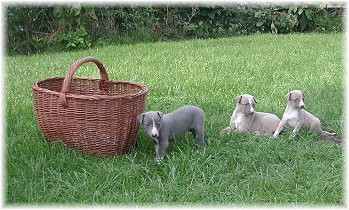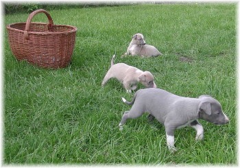 Sonntagsausflug Bei richtigem "Altweibersommer-Wetter" haben die kleinen Mäuse ihren ersten Ausflug in den Garten unternommen. Sie wurden im "Taxi-Korb" dorthin getragen. Im Ausflugslokal "Zum Steffen" gab's auch noch ein zünftiges Mittagessen - so lässt sich's leben als kleiner Welpe... |