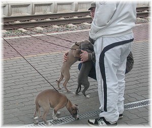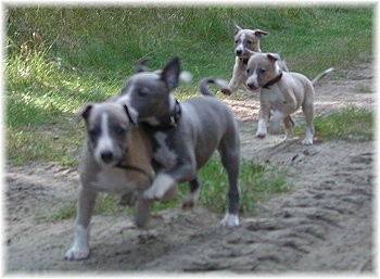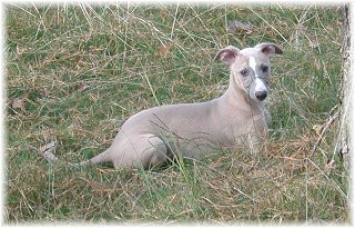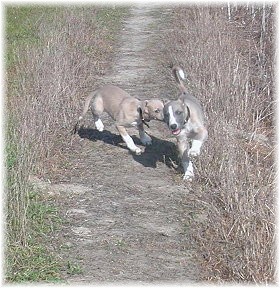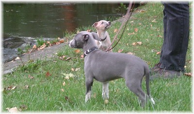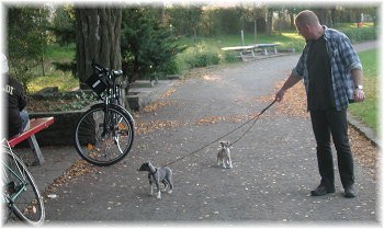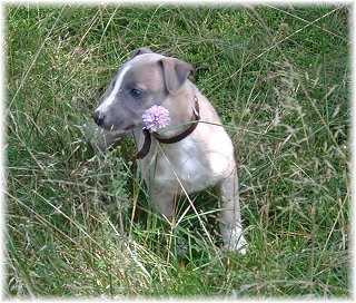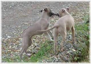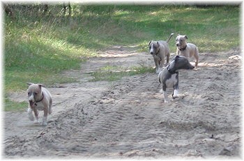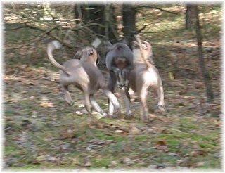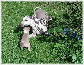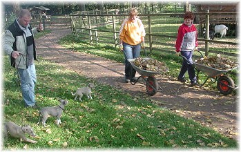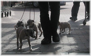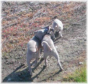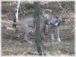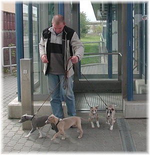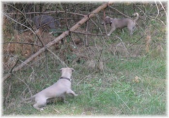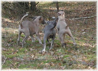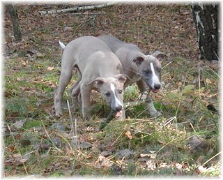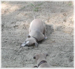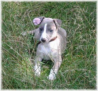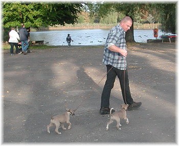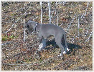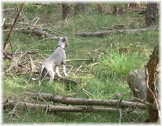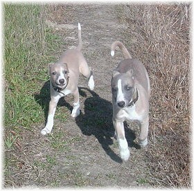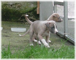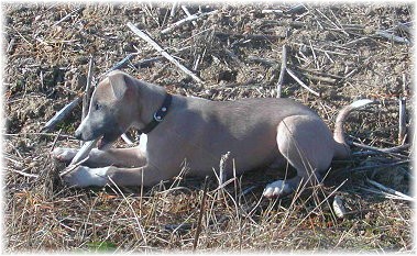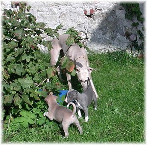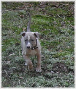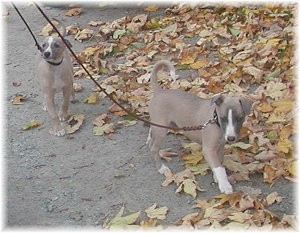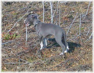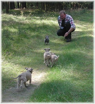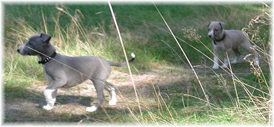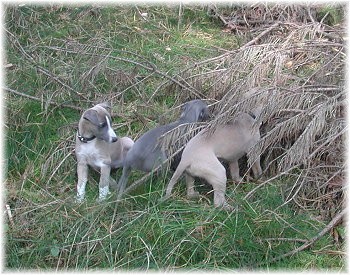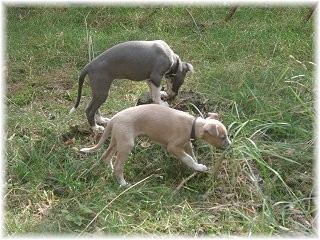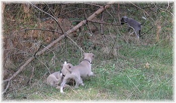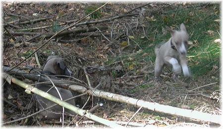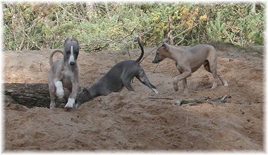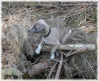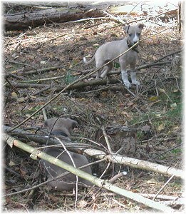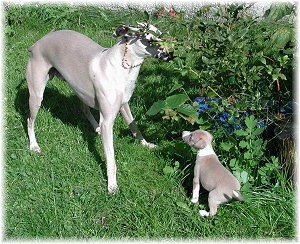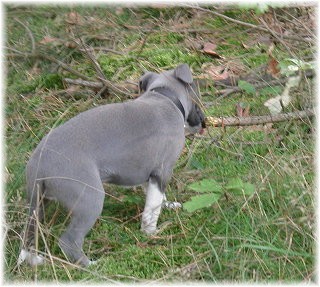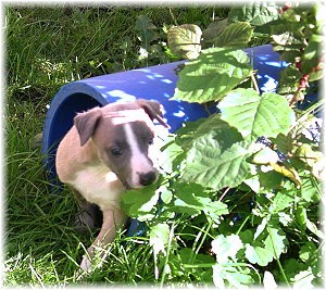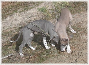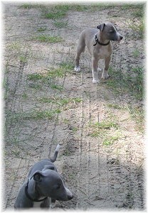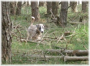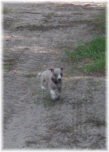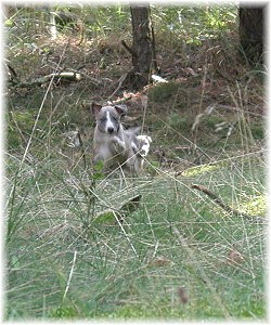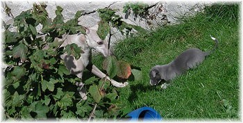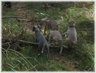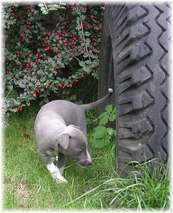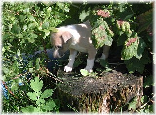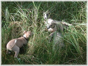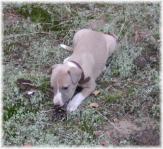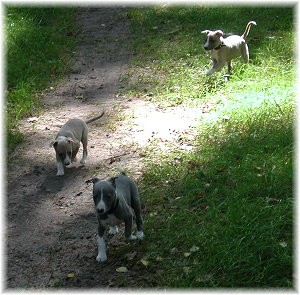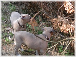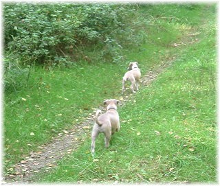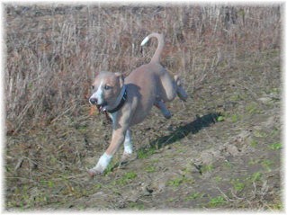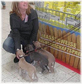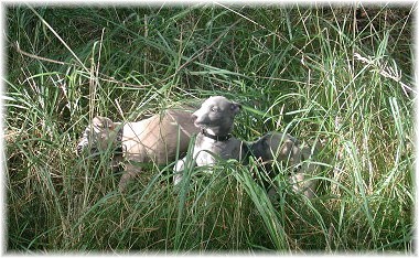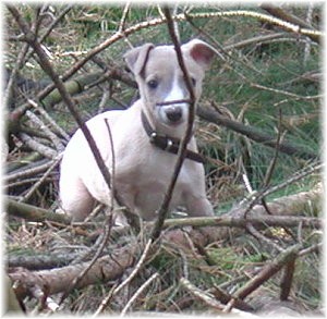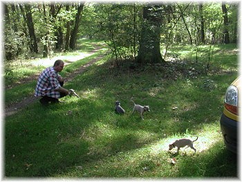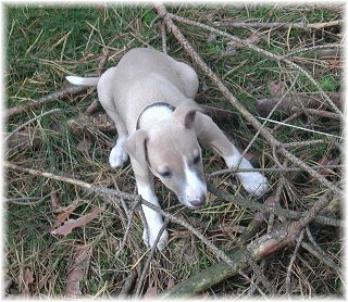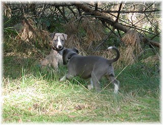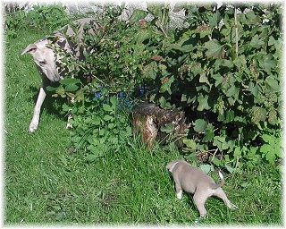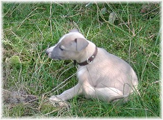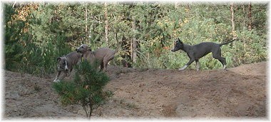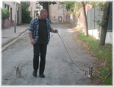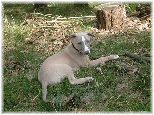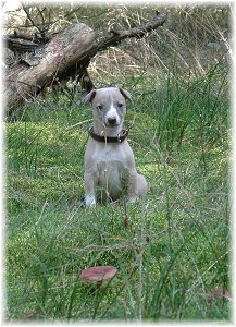 allein im Wald Heute sind die kleinen Flöhe 6 Wochen alt - Zeit für einen Ausflug in den Wald. Und so bekamen sie die Halsbänder um (auch daran muss sich ein kleiner Whippet gewöhnen), wurden ins Auto gesetzt und los ging's. Natürlich waren die Lütten nicht ganz alleine im Wald, wir waren ja dabei, aber sonst niemand. Bei so einem Ausflug gibt es genug zu entdecken und sie sollen frühzeitig lernen, sich an Herrchen und Frauchen zu orientieren und nicht an einem anderen Hund, um so auch ihre eigenen Charaktere entwickeln zu können. Die Kleinen hatten viel Spaß und Auto fahren war auch nicht schlimm - jedenfalls ist keinem schlecht geworden. |