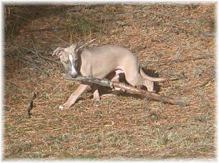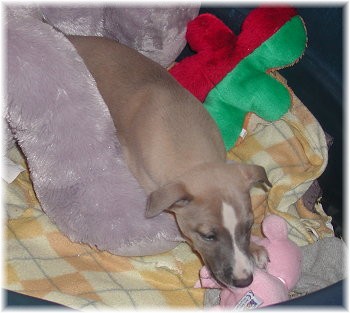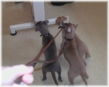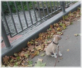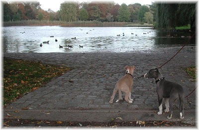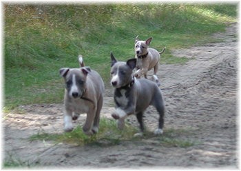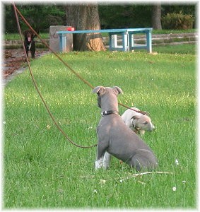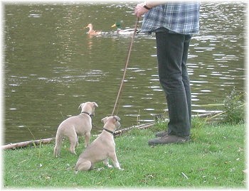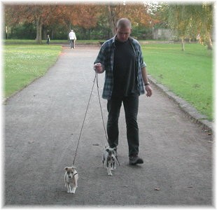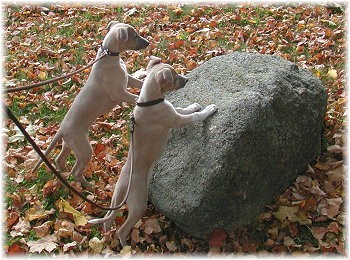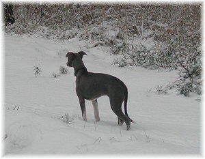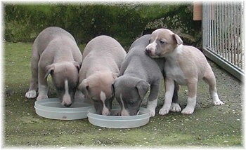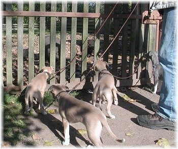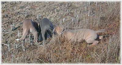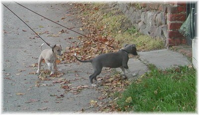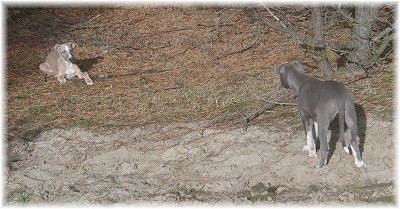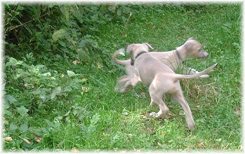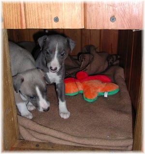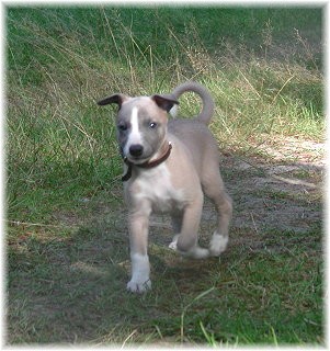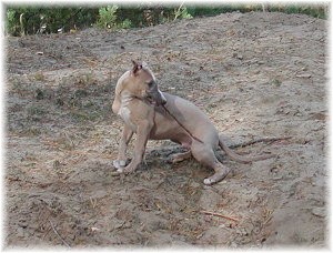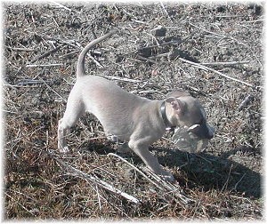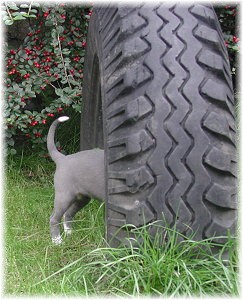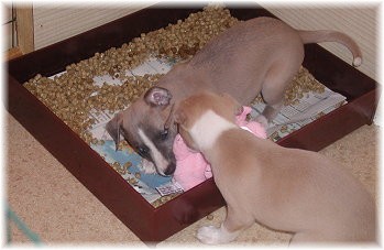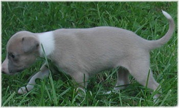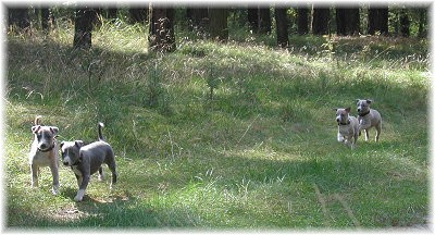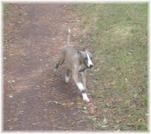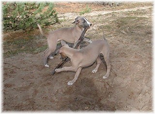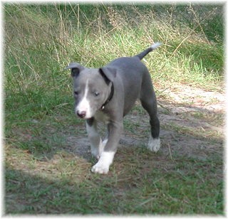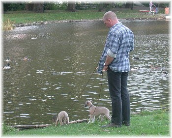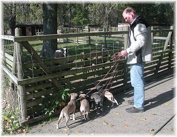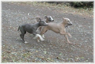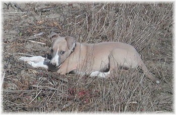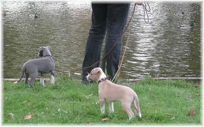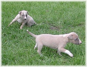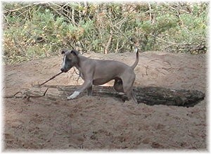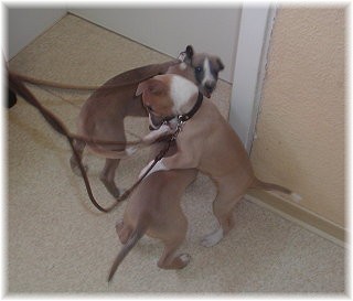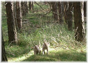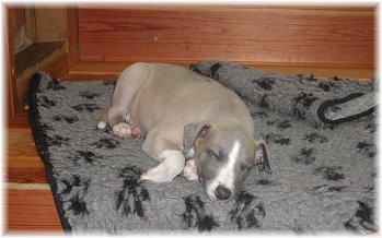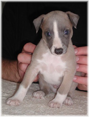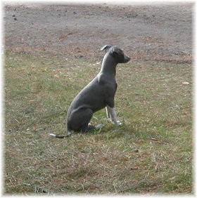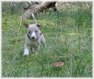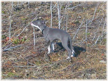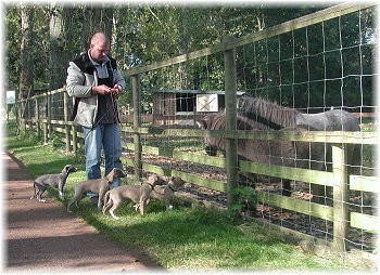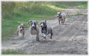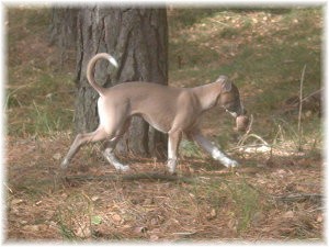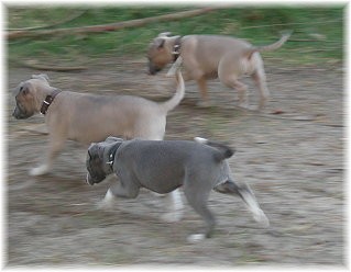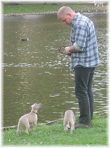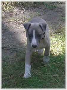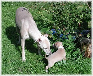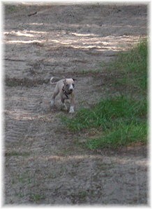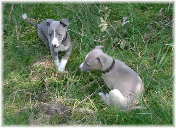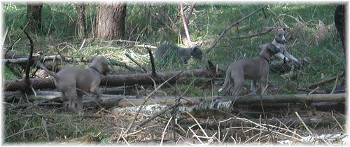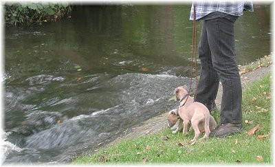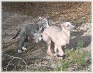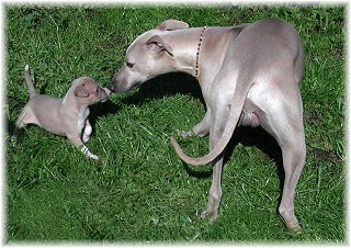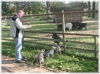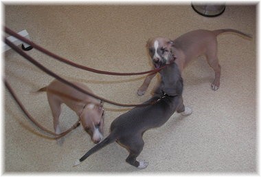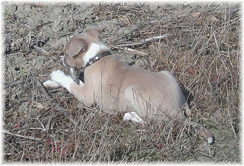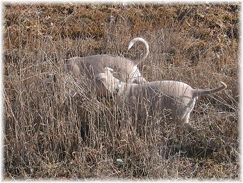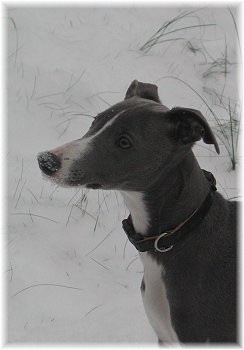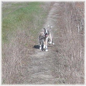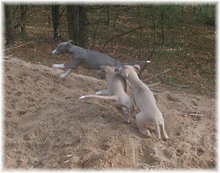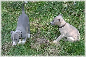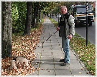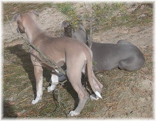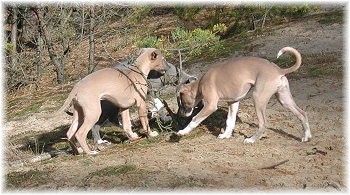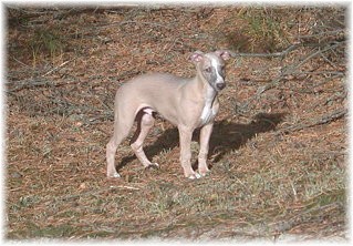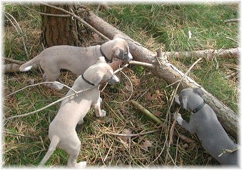 allein im Wald Heute sind die kleinen Flöhe 6 Wochen alt - Zeit für einen Ausflug in den Wald. Und so bekamen sie die Halsbänder um (auch daran muss sich ein kleiner Whippet gewöhnen), wurden ins Auto gesetzt und los ging's. Natürlich waren die Lütten nicht ganz alleine im Wald, wir waren ja dabei, aber sonst niemand. Bei so einem Ausflug gibt es genug zu entdecken und sie sollen frühzeitig lernen, sich an Herrchen und Frauchen zu orientieren und nicht an einem anderen Hund, um so auch ihre eigenen Charaktere entwickeln zu können. Die Kleinen hatten viel Spaß und Auto fahren war auch nicht schlimm - jedenfalls ist keinem schlecht geworden. |