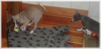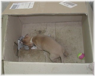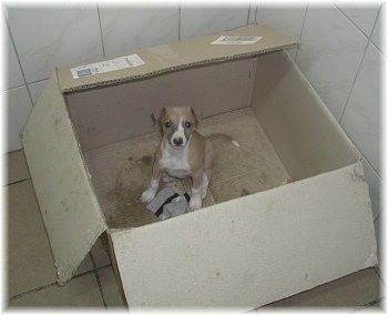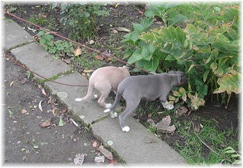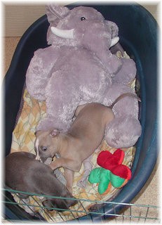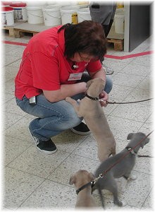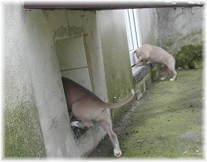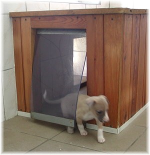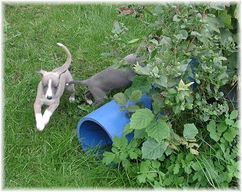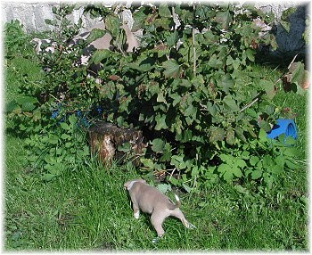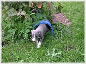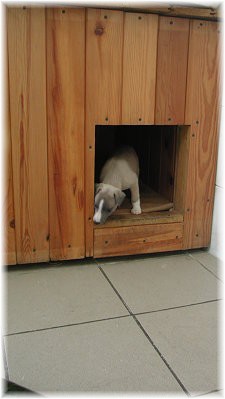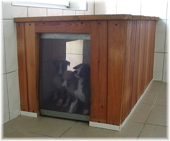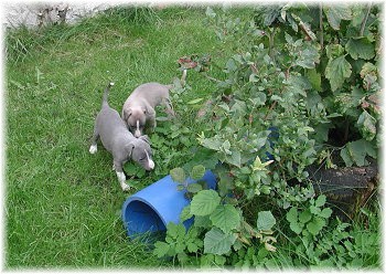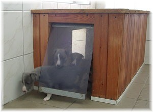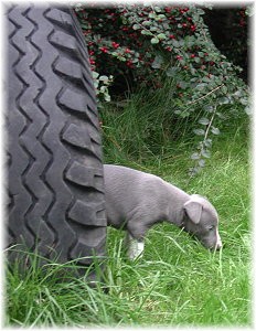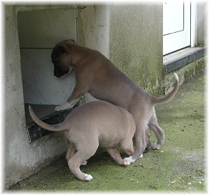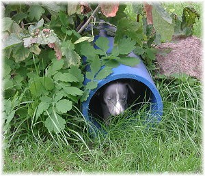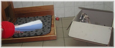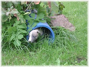 We1penauslauf Nach einigen Ausflügen auf den Hof und in den Garten haben die kleinen Mäuse nun den Welpenraum mit Auslauf kennen gelernt. Dort werden sie zukünftig jeden Tag einige Stunden verbringen. Sie können drinnen oder draußen spielen, durch den Tunnel mit Klappe gelangen sie rein oder raus. So lernen sie auch schnell, dass die kleinen und größeren Geschäfte draußen erledigt werden - ein weiterer Schritt auf dem Weg zur Stubenreinheit. |