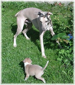 Bruder Im Welpenauslauf gibt es immer die Möglichkeit für soziale Kontakte. Im Gegensatz zu Leroy findet Juke seine kleinen Halbgeschwister sehr interessant. Vorsichtig spielt er sogar mit ihnen - nicht unbedingt typisch für einen jungen Kerl wie ihn... ;-) |