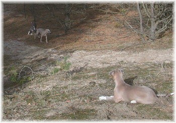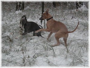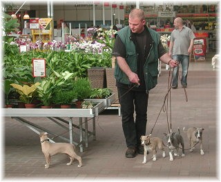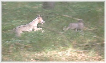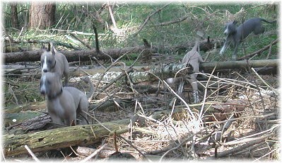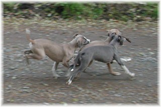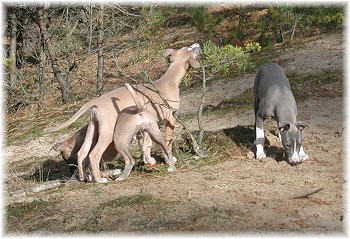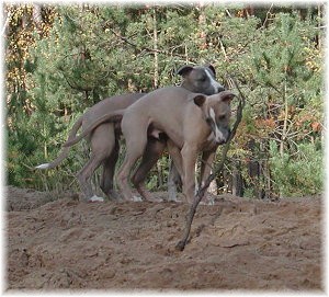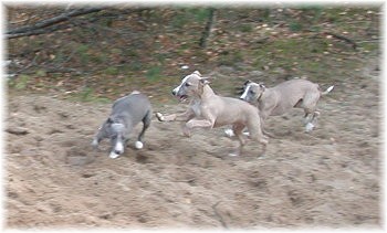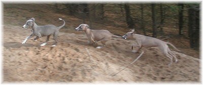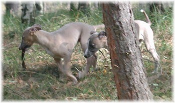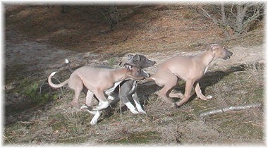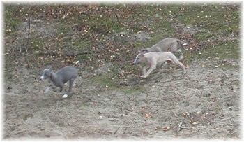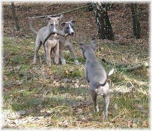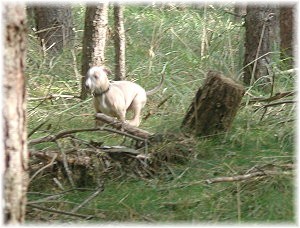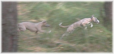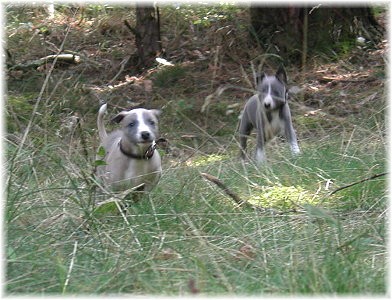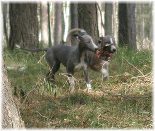 Waldlauf! Heute ist Günni den letzten Tag bei uns. Bei schönem Wetter fuhren wir mit den Flöhen in den Wald, wo sie ihre Kreise drehen konnten. Es gab Stöckchen zu finden und in rasender Geschwindigkeit ging es auf und ab und um die Bäume rum - früh übt sich, was ein richtiger Whippet werden will ;-). Und offensichtlich hat es ihnen wieder Spaß gemacht. |