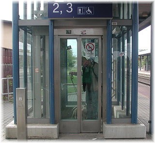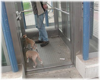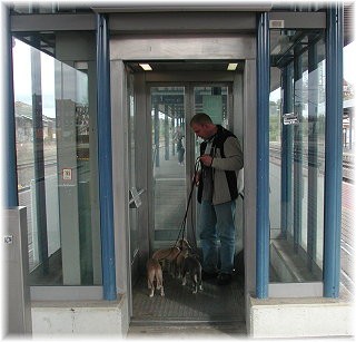 Dann gehen Jupp und Günni mit Herrchen in den Fahrstuhl, wir müssen zum anderen Gleis, weil dort der nächste Zug kommt. |