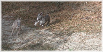 Tess, guck mal, der Jupp ist vorne weg. Den holen wir ein! | Hey, Jupp - wir sind viel schneller als Du! | |
