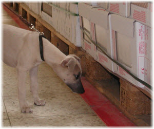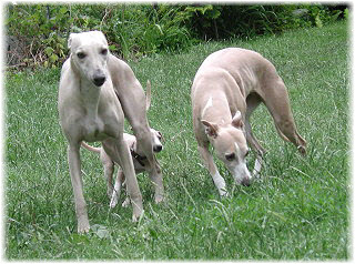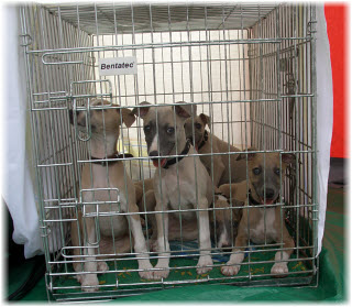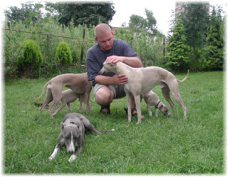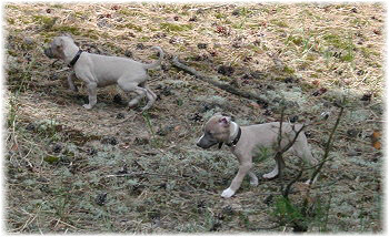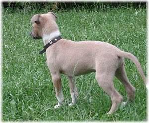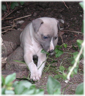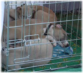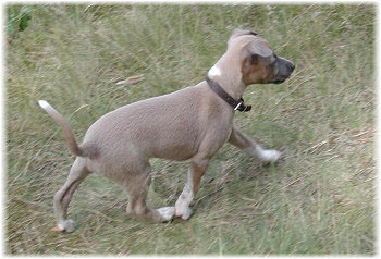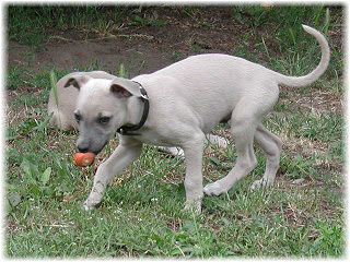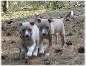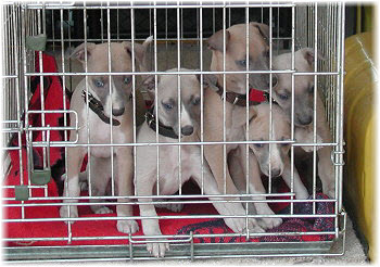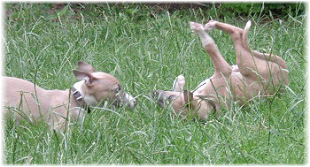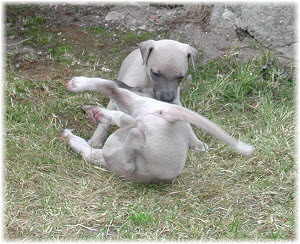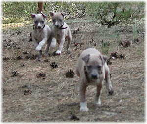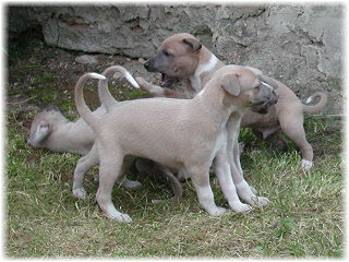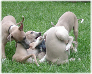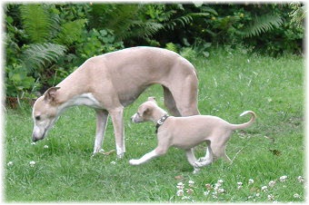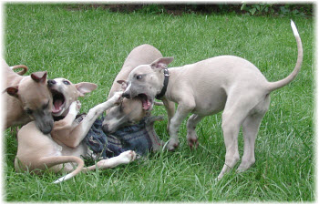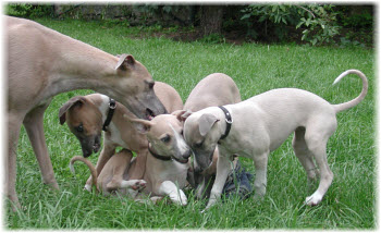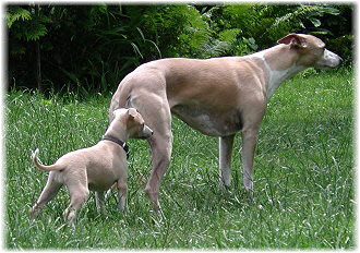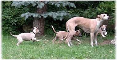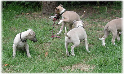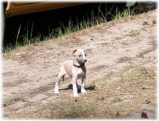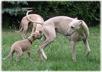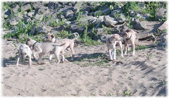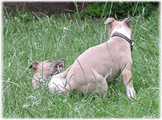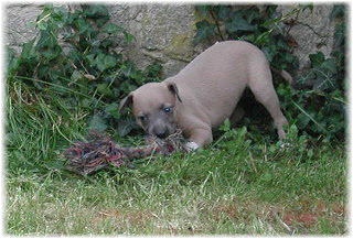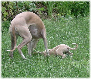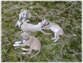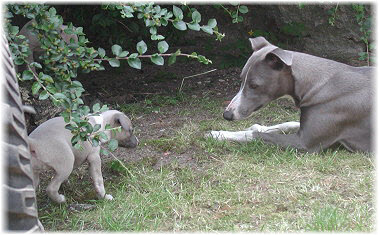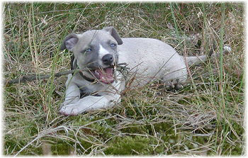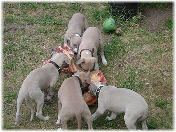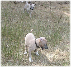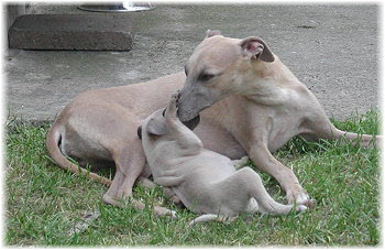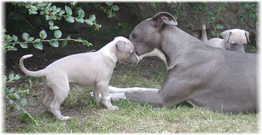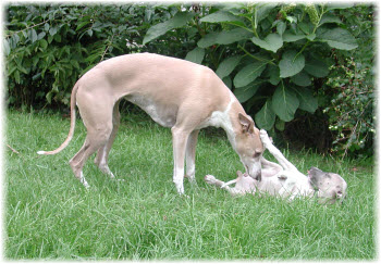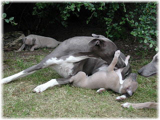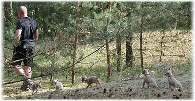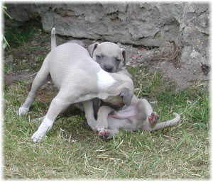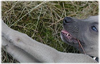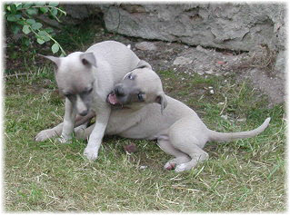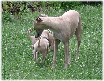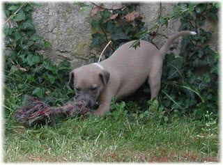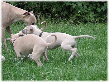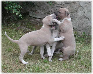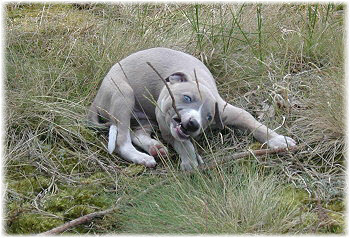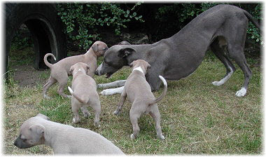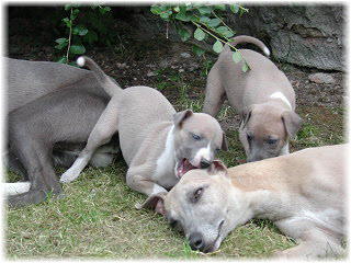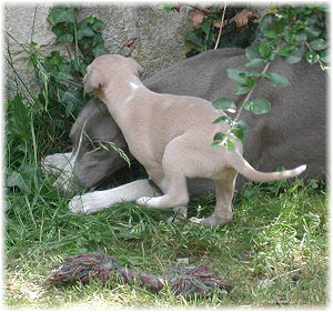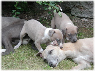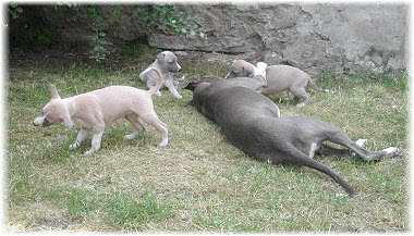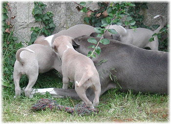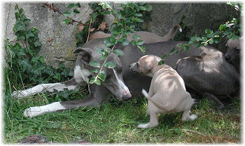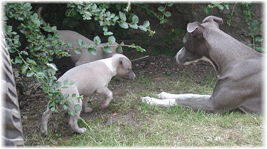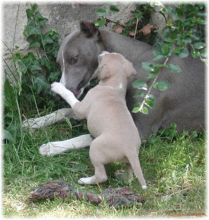 Tess! Bei dem schönen Wetter sind die Kleinen jetzt tagsüber draußen im Welpenraum mit Auslauf. Hier lernen die Kleinen, ihre Geschäfte draußen zu erledigen und es klappt auch schon recht gut, wenn man bedenkt, dass sie noch nicht einmal 5 Wochen alt sind. Tess interessiert sich sehr für die kleine Bande und spielt unter unserer Aufsicht sehr ausgiebig mit ihnen. Kelly ist dann meistens auch zugegen und beobachtet, was die "wilde Tante" so mit ihren Kindern treibt. Manchmal scheint es, als sei Tess auch nicht erwachsener als ihre Nichten und Neffen, aber für die Sozialisierung ist sie ein guter Partner. |