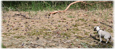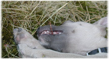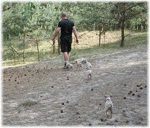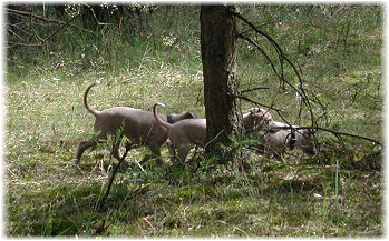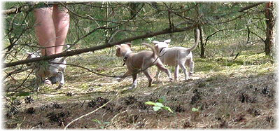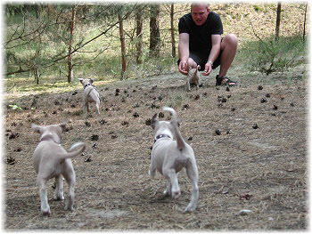 Ausflug! Morgen werden die Flöhe schon 6 Wochen alt. Zeit, bei dem schönen Wetter einen Ausflug zu machen. Also luden wir die kleine Schar ins Auto und fuhren in den Wald. Vorher bekamen sie noch die Halsbänder um - wenn man die Umwelt neu entdeckt, stören sie nicht so... |