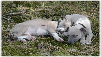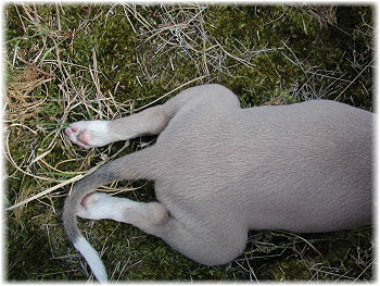 Tunnelblick Die Kleinen suchen sich manchmal schon merkwürdige Schlafplätze. Bono schläft hier auf der Decke, die er in den Tunnel gezogen hat, der sich im Eingangsbereich des Welpenhauses befindet, damit Kälte und Wind nicht rein wehen. Er findet's wohl gemütlich. |