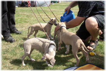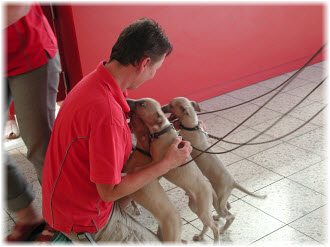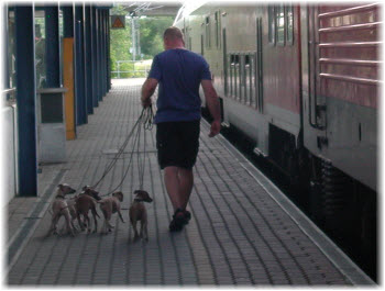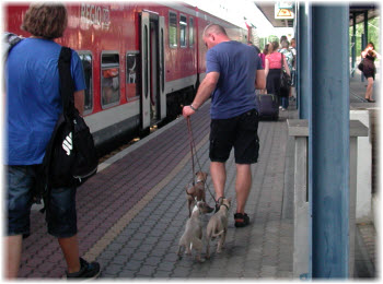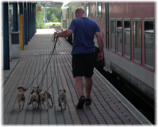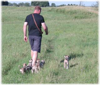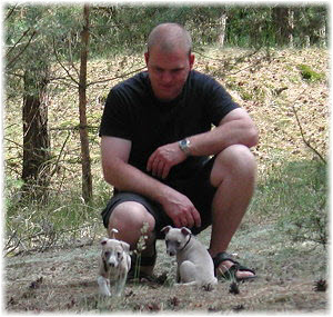 Verbandssieger In Köln fand heute die Verbandssieger-Ausstellung des DWZRV statt. Die Flöhe sind mit ihren knapp 10 Wochen alt genug, um uns zu begleiten. Eine Ausstellung bietet viele Kontaktmöglicheiten mit anderen Hunden, vielen Menschen, Kindern etc. - und alle wissen, wie man vernünftig aufeinander zugeht. Ein idealer Platz also für unsere Flöhe, die alle Situationen prima meisterten. Wir trafen dort auch die zukünftigen Besitzer von Hank, von denen die Fotos stammen (danke dafür!), da wir Juke und Tess ausstellten und uns mit den Kleinen beschäftigten. Abends fiel ihnen der Abschied von Hank schwer, aber er muss noch ein wenig lernen, bevor er in die Welt zieht. Und so fuhr er wieder mit uns nach Hause. |