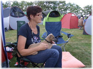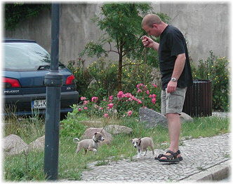 Und auch hier muss alles erkundet werden. | Blondie schaut mit Herrchen dem munteren Treiben zu. | |