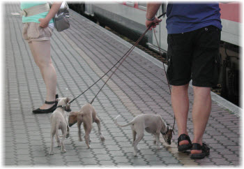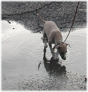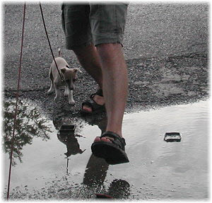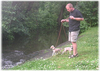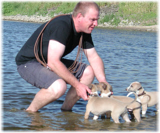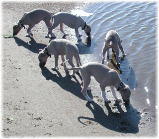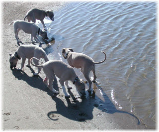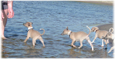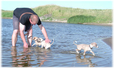 Die kleine Bande folgt Herrchen. Wo gehen wir nur hin? | Das ist nass an den Füßen. Aber auch erfrischend... | |