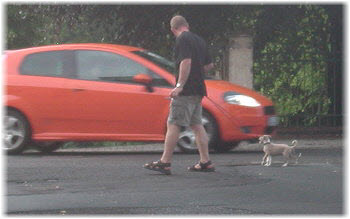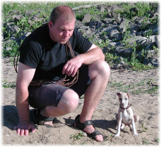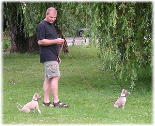 Herrchen lockt Blondie mit der "Reizangel". | ||