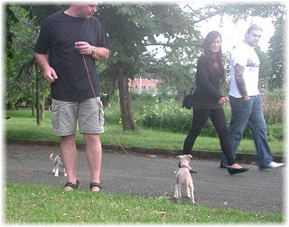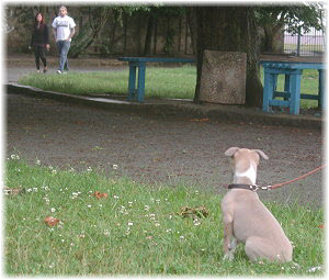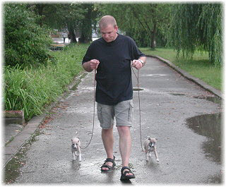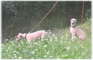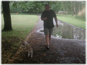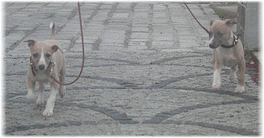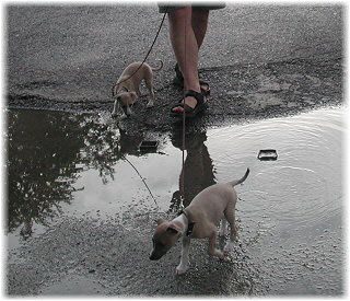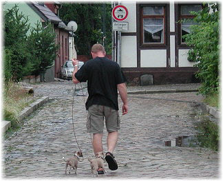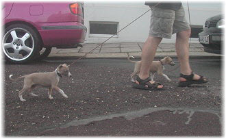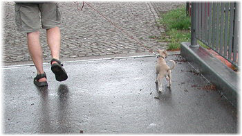 die Leine - los! Es ist an der Zeit, den Kleinen mehr von der großen weiten Welt zu zeigen und dazu gehört natürlich auch das Leinentraining. Zwischen den derzeit häufigen Schauern gehen wir mit den Kleinen durch Burg. Hier exemplarisch eine Runde mit Nat und Blondie. |