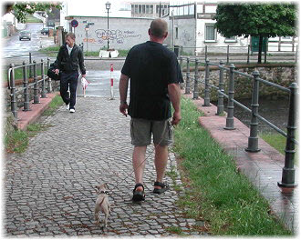 Blondie geht mal ein Stück allein mit Herrchen - und dann über die Brücke über den kleinen Fluss Ihle. |