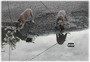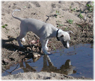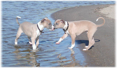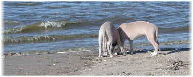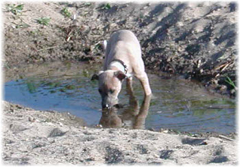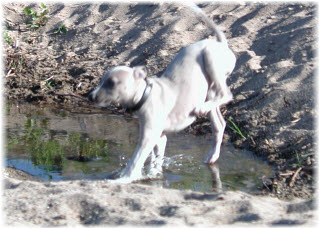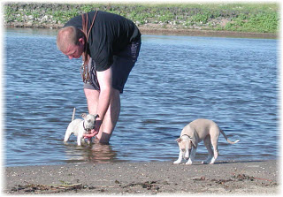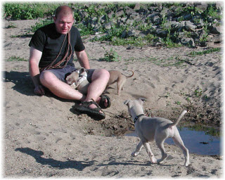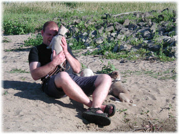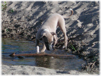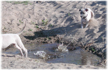 Wasserspiele Es war ein heißer Tag heute. Da tut Abkühlung für Hund und Mensch gut. So fuhren wir mit den Lütten an die Elbe, die zur Zeit Niedrigwasser führt und deren Buchten zum Spielen und Toben einladen. Die Kleinen hatten viel Spaß - vor allem, wenn der Sand so schön spritzte. |