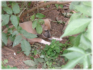 Dann bellt der "blöde Schäferhund" von nebenan. Joya schmuhlt durch's Gebüsch. Beide Mädels sind sich einig: Der ist laut und doof. |