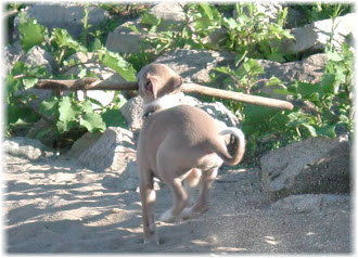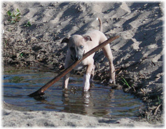 Hank hat einen Stock im Wasserloch gefunden, den er stolz weg trägt. | ||