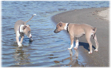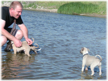 Aber wenn Herrchen ruft, geht er doch... | Hey, Flöhe. Kommt ins Wasser! Das ist schon kühl! | |