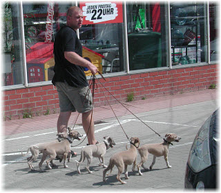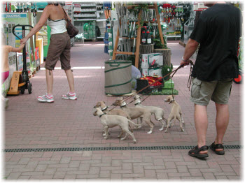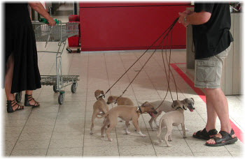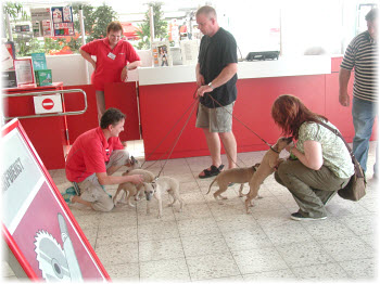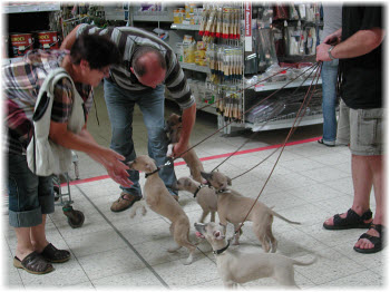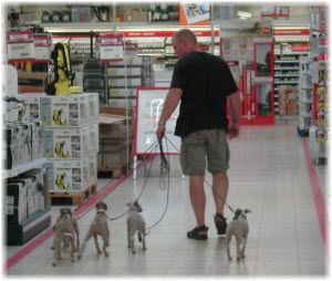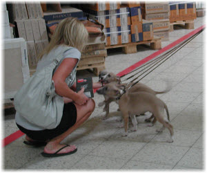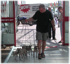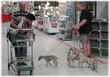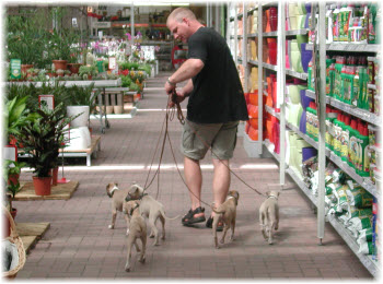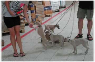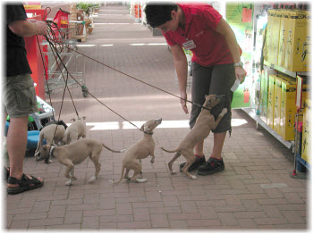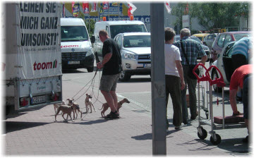 Toom! Heute stand ein Besuch im Baumarkt auf dem Programm. Mit großem Hallo und einem aufgeregten "Sabine! Komm mal schnell, da sind kleine Hunde!" wurde die kleine Bande dort begrüßt. Hier gibt es immer Leute, die "fummeln" müssen und andere, die mit ihrem ratternden Einkaufswagen einfach vorbeiziehen. Eine gute Umgebung also, um viele Eindrücke zu gewinnen. |