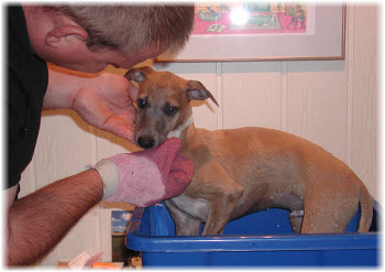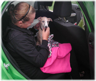Freitagabend ist Blondie dran mit Baden. | Blondie kurz vor der Abfahrt. Auch sie sitzt auf der Decke, die sie wie ihre Brüder mitgenommen hat - mit einem Duft von "Zuhause". | |