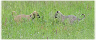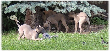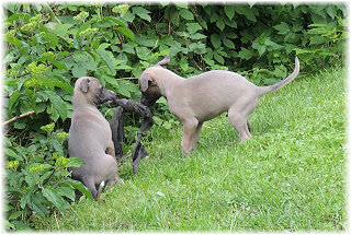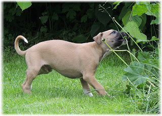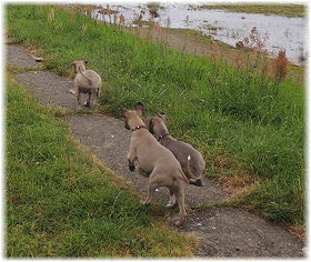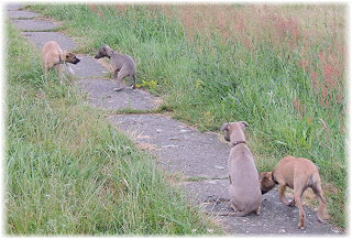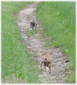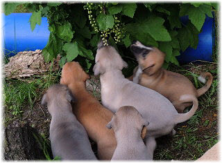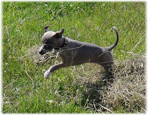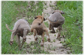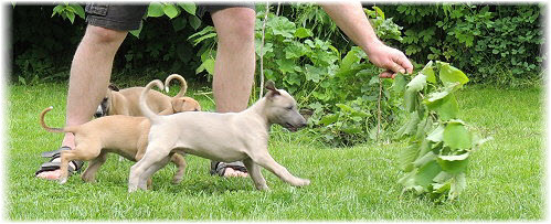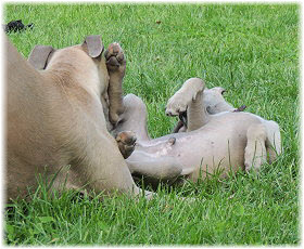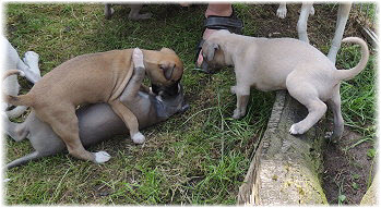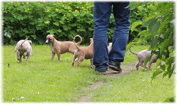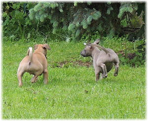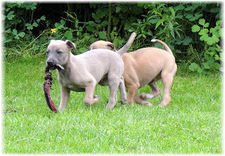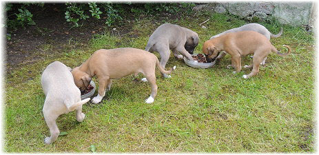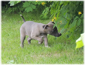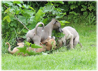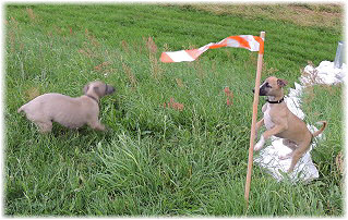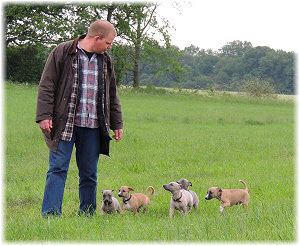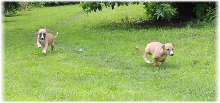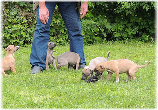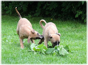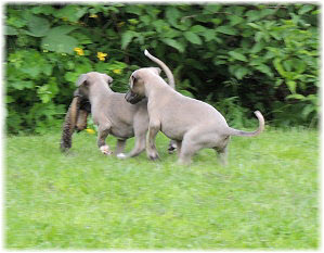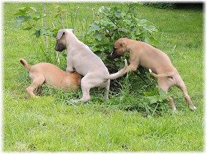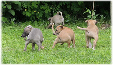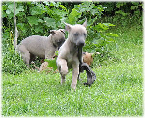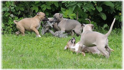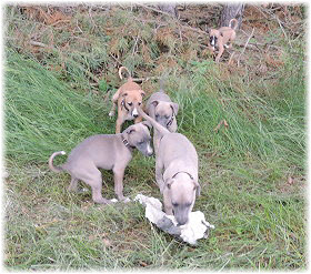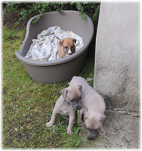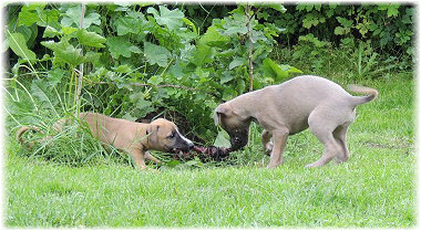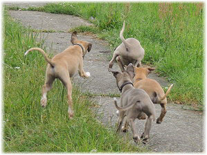 Die Fl�he sind heute sechs Wochen alt. Eigentlich Zeit, um mit ihnen mit dem Auto zum ersten Waldausflug zu fahren. Das heranziehende Regentief hat uns aber davon abgehalten. Daf�r gab es wieder eine Spielrunde im Garten, den die Kleinen nach und nach f�r sich entdecken. Die gro�en Hunde sind noch nicht dabei, damit sich die L�tten in Ruhe mit der Umwelt auseinandersetzen k�nnen. |