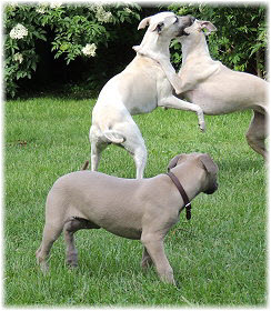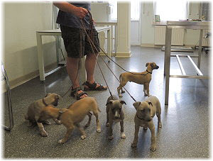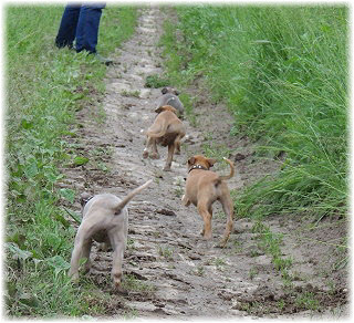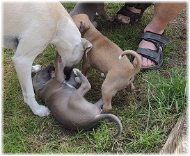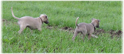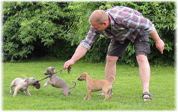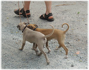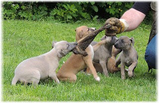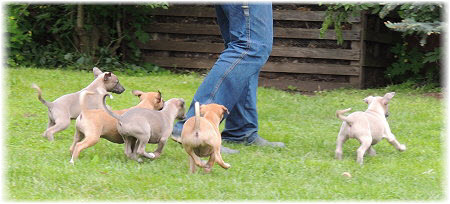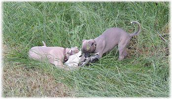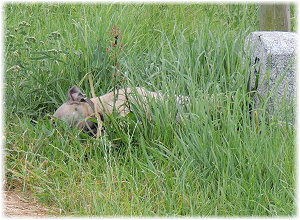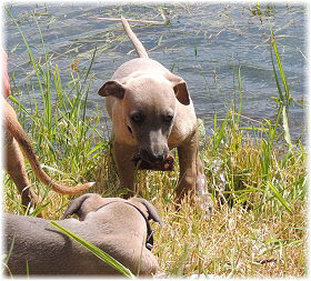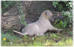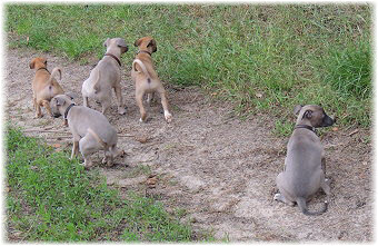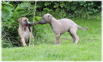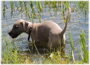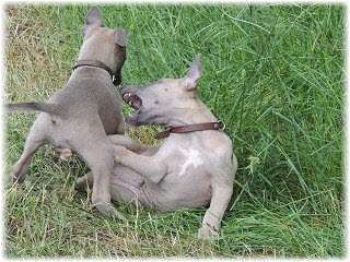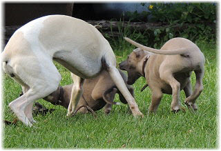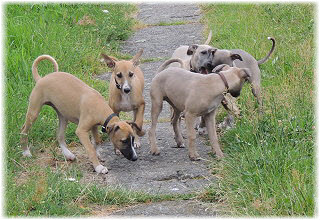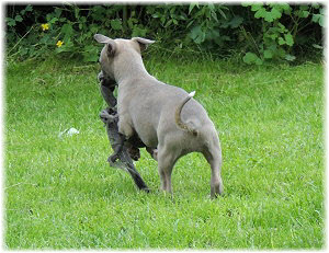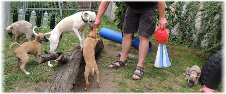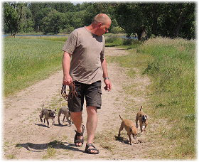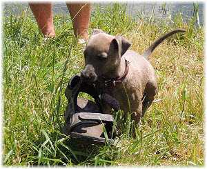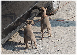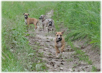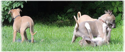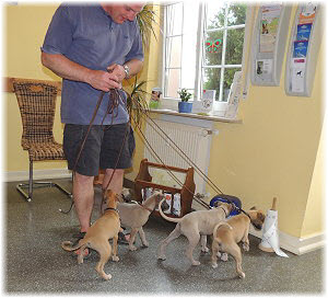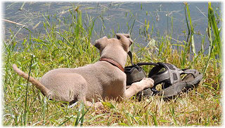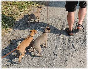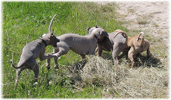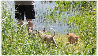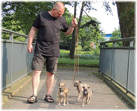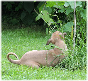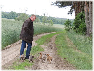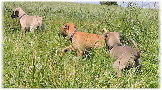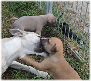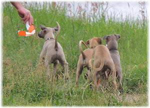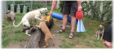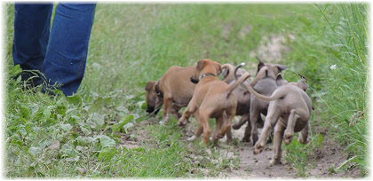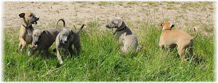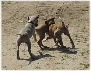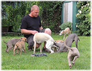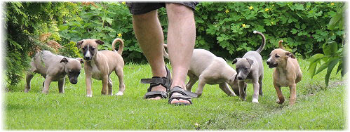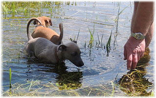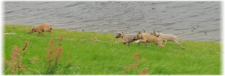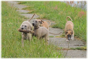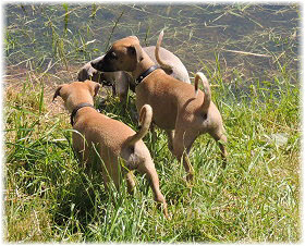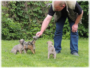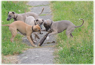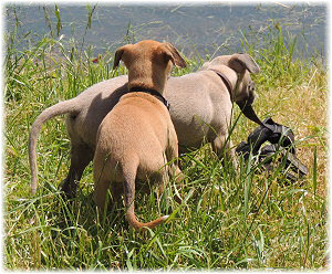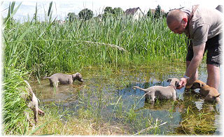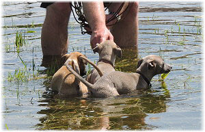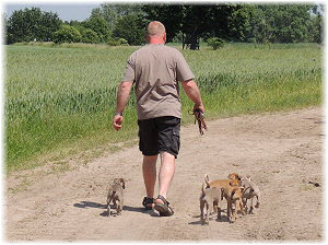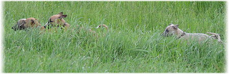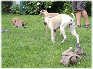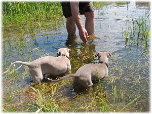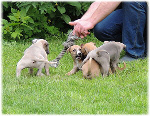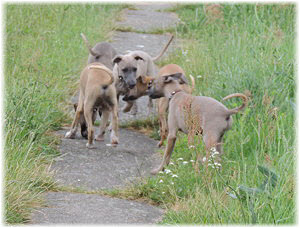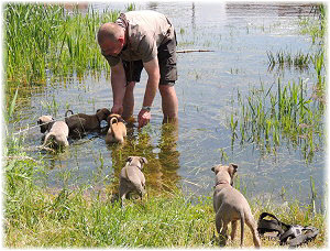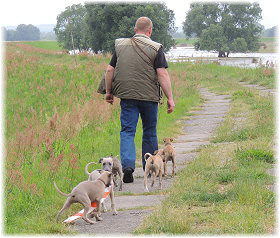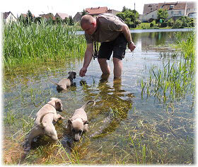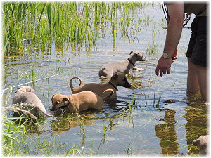 Die letzten Tage waren zu hei�, um an der Leine spazieren zu gehen. Somit haben wir die Fl�he jeden Tag ins Auto geladen und sind zum See gefahren. Dort konnten sie sch�n toben. Seit ein paar Tagen schlafen die Kleinen nachts in der Box. Abends gehen sie nochmal raus in den Garten und schlafen dann 6 bis 7 Stunden durch. Ein weiterer Schritt zu einem geregelten Ablauf. Sozialisierung erfolgt im Rudel. Und deshalb muss sich das Floh-Rudel kontrolliert auch mit unseren erwachsenen Hunden auseinandersetzen - auch wenn von denen der Eine oder Andere dazu nur wenig Lust hat. |
