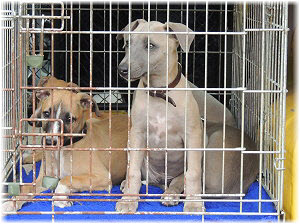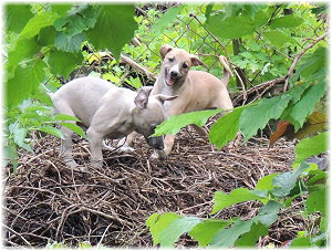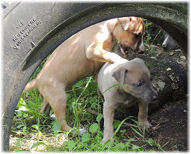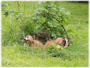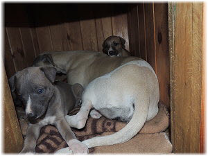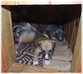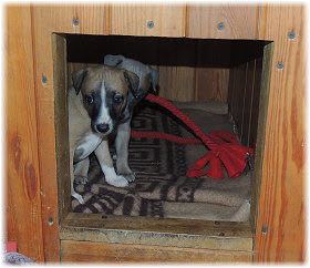Die Fl�he nutzen die H�tte im Welpenraum zum Schlafen und bei Regenwetter auch zum Spielen. Richtig lustig wird's, wenn Lotta dazu kommt. |