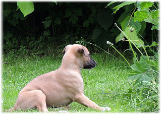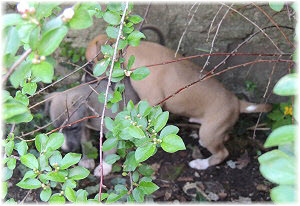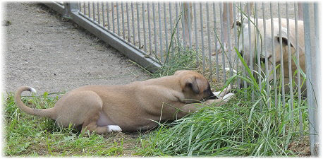 Ole versucht sich als Klettermaxe, sehr geschickt, der L�tte. | Und dann geht es zur�ck in den Welpenraum, die grauen Wolken nahen. | |