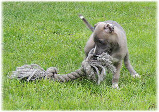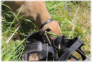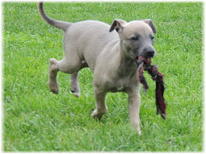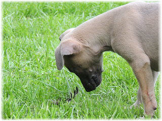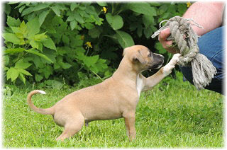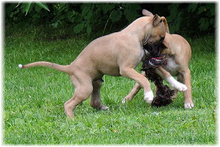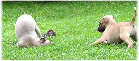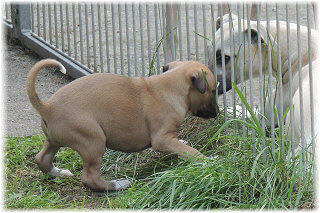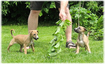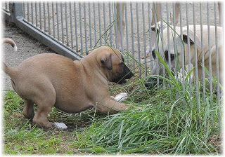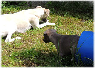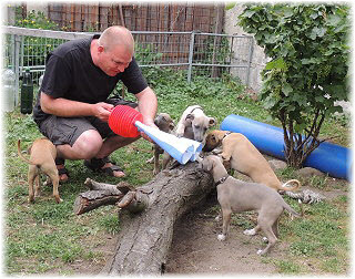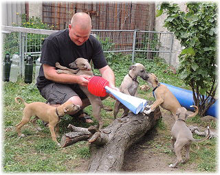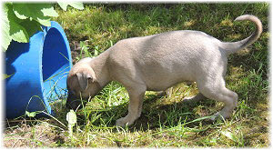Im Welpenauslauf haben die Fl�he immer viel zu tun, weil es soviele Dinge neu zu entdecken gibt. Es k�nnte ja sein, dass sich das Spielzeug seit gestern ver�ndert hat... ;-). Heute machte Herrchen bei den Kleinen viel L�rm. Mit Tr�te und Klapper bewaffnet ging er in den Welpenauslauf. |