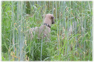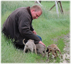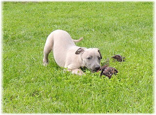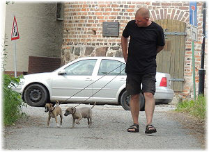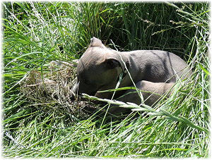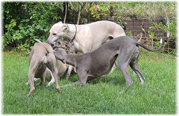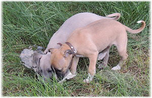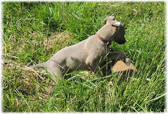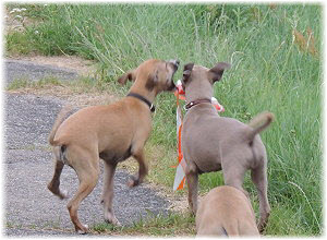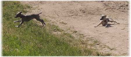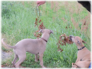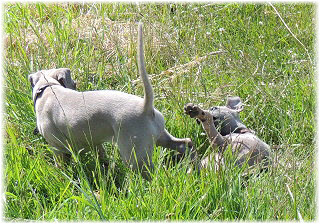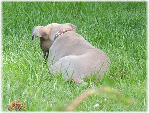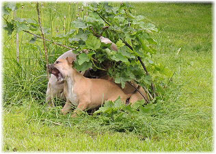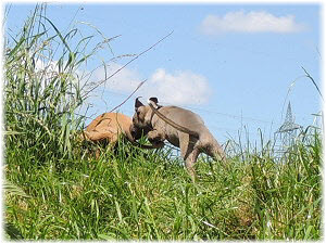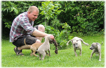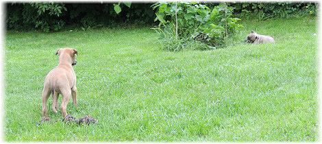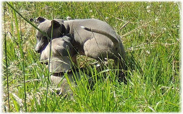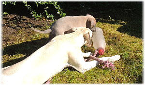 Herrchen leitet die n�chste Spielrunde ein. | Ole mag's gerade ruhiger. | Und Caisa hat ein Grasb�schel. |
