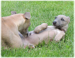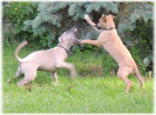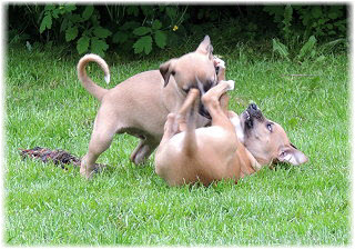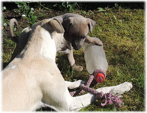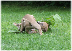 ...Caisa und Lasse toben. Caisa wie immer mit den Pf�tchen zuerst. Kleine Mieze-Caisa... ;-) |