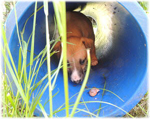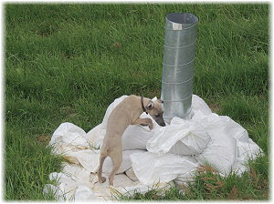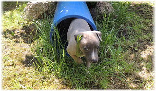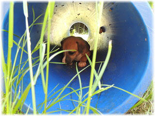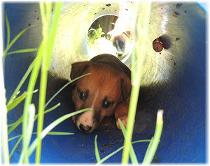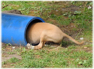Die R�hre im Welpenauslauf inspiriert jeden Welpen zu etwas Anderem. Lotta wundert sich, was da so interessant sein soll. |