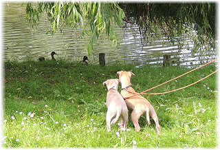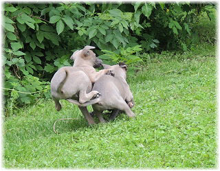 Argw�hnisch beobachten Joya und Juke das lustige Treiben. Juke muss sein linkes Bein noch schonen. |