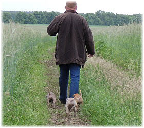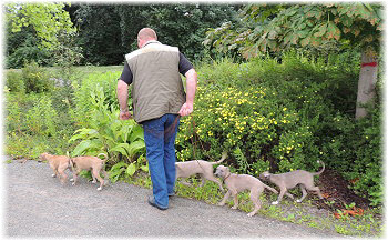 Fl�he, Fl�he! Fr�hlich folgt die kleine Bande Herrchen in den Garten. | ||
