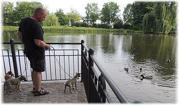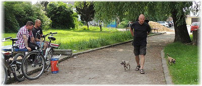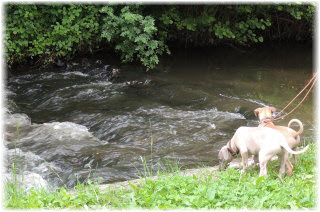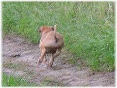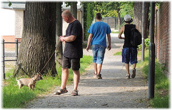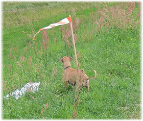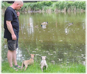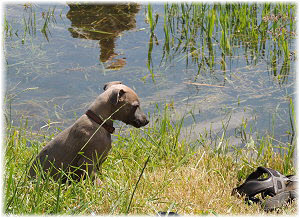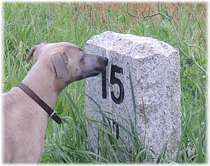 Lasse untersucht derweil den Kilometerstein, der etwas besch.... aussieht. | Ob das Wasser kalt ist? | Hi Herrchen, Du bist ja auch noch da! |