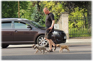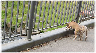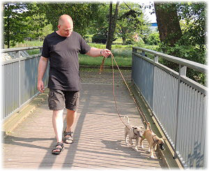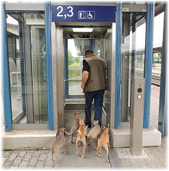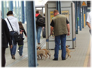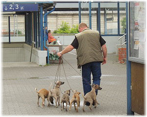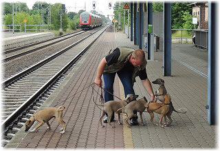 Zuerst gibt es eine Runde im Park. | Dann geht es zum Bahnhof. | Flip und Caisa m�ssen auf dem Bahnsteig toben. |