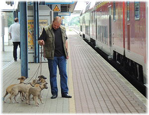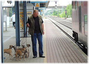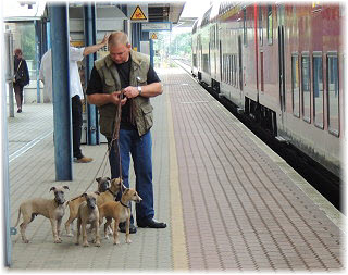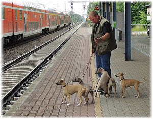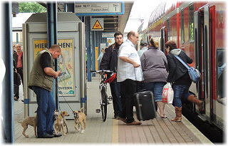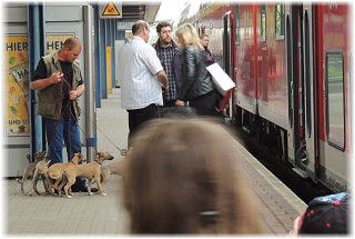 Am Bahnhof Seit einiger Zeit holt Herrchen jeweils mit einem der Fl�he Frauchen vom Bahnhof ab. Hier fahren derzeit mehr Z�ge durch, weil die ICE-Strecke �ber Stendal seit dem Hochwasser gesperrt ist. Heute war Frauchen nicht im Zug, sondern mit der Kamera und allen Fl�hen am Bahnhof dabei. |
