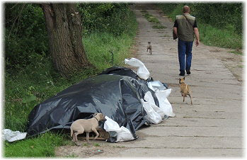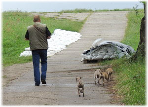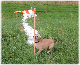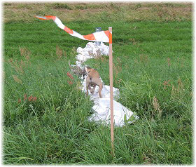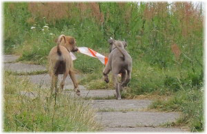 Kommt Fl�he, wir gehen auf dem Deich lang. | Die Fl�he finden ein St�ck Absperrband. | Ein tolles Spielzeug! |