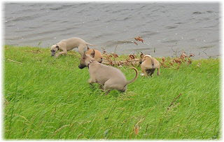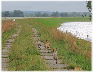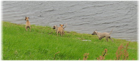 Die Fl�he untersuchen den Deich und rennen runter zum Wasser. | Das Hochwasser hat viele �ste und Holzst�cke zur�ckgelassen. | Ins Wasser gehen die Fl�he bei dem Wetter aber nicht. |