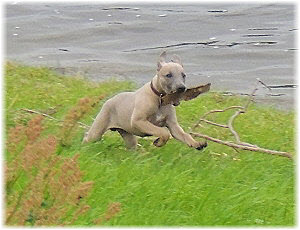 Dann wirft Herrchen ein St�ckchen. | Lasse hat's. | N�chste Runde. Lasse hat's schon wieder. |